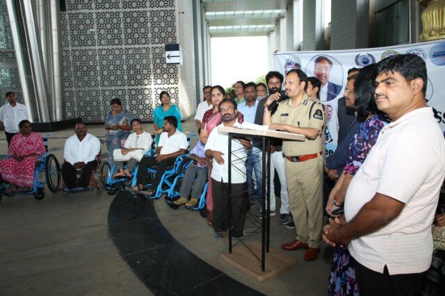 వి.సి. సజ్జనర్, ఐపీఎస్ హైదరాబాద్ నగర పోలీస్ కమిషనర్గా బాధ్యతలు స్వీకరించిన శుభ సందర్భంగా, వికలాంగుల నెట్వర్క్, ఫ్రీడమ్ అసోసియేషన్, ట్రిపుల్ ఆర్ ఫౌండేషన్ మరియు NAMC ట్రస్ట్ సంయుక్తంగా దివ్యాంగులకు ఉచిత వీల్ చైర్ల పంపిణీ కార్యక్రమాన్ని బంజారాహిల్స్, రోడ్ నెం. 12లోని ఇంటిగ్రేటెడ్ కమాండ్ అండ్ కంట్రోల్ సెంటర్ (ICCC) భవనంలో ఘనంగా నిర్వహించారు. ఈ కార్యక్రమానికి ముఖ్య అతిథిగా హాజరైన కమిషనర్ వి.సి. సజ్జనర్ స్వయంగా లబ్ధిదారులకు వీల్ చైర్లను పంపిణీ చేశారు.