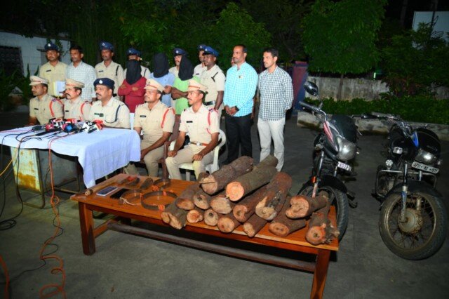 నల్లగొండ జిల్లాలో గత రెండు నెలలుగా రైతులు కొన్ని సంవత్సరాల కాలం పాటు పెంచుకున్న శ్రీగంధం చెట్లను అక్రమంగా నరికి దొంగతనాలకు పాల్పడుతున్నారని సమాచారం మేరకు తేది : 30.09.2025 అర్ద రాత్రి సమయములో కనగల్ మండల పరిధి లోని నేషనల్ హైవే 595 రోడ్ కి సమీపములోని ఒక శ్రీ గంధం చెట్లు ఉన్న చిలుక విద్యాసాగర్ తోట లోకి వెళ్ళి చెట్లు కోసే రంపం మిషన్ లు, గొడ్డల్లు, ఉపయోగించి తోటలో 10 శ్రీగంధం చెట్ల మొద్దులు దొంగిలించుకొని, ఇంకా 5 శ్రీగంధం చెట్ల నరికి వదిలివేసినారు అని చిలుక విద్యాసాగర్ రెడ్డి పిర్యాదుపై కేసు నమోదు చేయనైనది. ఇట్టి కేసు పరిశోదనలో బాగంగా, జిల్లా ఎస్.పి. శరత్ చంద్ర పవర్, ఐపిఎస్, ఆదేశాల ప్రకారం, నల్లగొండ డి.ఎస్.పి కె.శివరాం రెడ్డి ఆధ్వర్యములో నాలుగు బృంధాలుగా ఏర్పడి తనిఖీలు చేయుచుండగా, ఉదయం 06.00 గం,,ల సమయంలో కనగల్ పోలీసులు నల్గొండ – దేవరకొండ రహదారిపై రంగారెడ్డి బంగ్లా వద్ద వాహానాలు తనిఖీలు నిర్వహిస్తుండగా దేవరకొండ వైపు నుండి నల్గొండ వైపు కి రెండు బైక్ AP-31-BS-1571,AP-28-DQ2491 లపై వెళ్ళు చున్న ముగ్గురు అనుమానస్పధముగా వెనుకకు తన బైక్ లను తిప్పుకొని వెళ్ళుచుండగా వారిని కనగల్ పోలీస్ వారు పట్టుబడి చేసి వారిని తనిఖీ చేయగా వారి వద్ద ఉన్న 3 రంపాలు, 3 గొడ్డల్లు, ఫెన్సింగ్ వైర్ కట్ చేసే ఒక కట్టర్, ఒక ఆక్సల్ బ్లేడ్, మూడు మొబైల్ ఫోన్ లు రెండు బైక్ ల పై వెళ్తున్నా ముగ్గురు వ్యక్తులను అదుపులోకి తీసుకొని విచారించగా ! A-1: అన్నాభౌ లక్ష్మణ్ గైక్వాడ్ , మహారాష్ట్ర (పరారీలో),A-2: దివానా తండ్రి కుక్కనీయ, మద్యప్రదేశ్,A-3: దద్ద సింగ్ తండ్రి రామ్ సింగ్, మద్యప్రదేశ్,A-4 మజాన్ తండ్రి అన్మెష్ సింగ్, మద్యప్రదేశ్,A-5: జవాస్ మధ్యప్రదేశ్ రాష్ట్రం (పరారీలో),A-6: అజుబా మధ్యప్రదేశ్ రాష్ట్రం (పరారీలో) పైన తెల్పిన ఏ-2 నుండి ఏ-6 నేరస్తులు వారందరు మద్య ప్రదేశ్ రాష్ట్రము, అజుబా గవన్ గ్రామం, రిటీ తహసిల్, కట్నీ మరియు పన్నా జిల్లాలకు చెందిన వారు. వీరు దేశము లోని వివిద ప్రాంతలో సంచార జీవనము గడుపుతూ రుద్రాక్షలు & పూసలు అమ్ముకొంటూ జీవనం గడుపుతుంటారు, వీరు ఎక్కడికి వెళ్ళిన గ్రామా శివారు ప్రాంతలో గుడారాలు వేసుకొని నివసిస్తుంటారు, గత రెండు నెలల క్రితం వీరికి మహారాష్ట కు చెందిన ఏ-1 అన్నాభాహు లక్ష్మణ్ గైక్వాడ్ అను వ్యక్తి పరిచయం అయినాడు. వీరు అంత హైద్రాబాద్ లో ఉన్నప్పుడూ ఏ-1 వీరి గుడిసెల వద్దకు వచ్చేవాడు. మీరు ఎన్ని రోజులు రుద్రాక్షలు అమ్మిన మీరు ధనవంతులు కాలేరని,మీరు నేను చెప్పినట్టు చేస్తే మీరు తొందరగా అధిక డబ్బులు సంపాదింవచ్చు అని, తెలంగాణ రాష్ట్రములోని వివిద ప్రాంతలోని రైతులు శ్రీ గంధం చెట్లు సాగు చేస్తుంటారు, అట్టి శ్రీ గంధం కర్రలకు మార్కెట్ లో మంచి డిమాండ్ ఉంది, కాబట్టి అట్టి చెట్లను నరికి ఏ-1 కు ఇస్తే, ఏ-1 వ