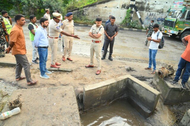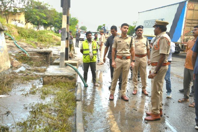 జాతీయ రహదారి 65 పై వర్షం నీరు కారణంగా చిట్యాల రైల్వే బ్రిడ్జి అండర్ పాస్ వద్ద ట్రాఫిక్ జామ్ అవుతున్న ప్రదేశాన్ని పరిశీలించిన జిల్లా ఎస్పీ శరత్ చంద్ర పవార్ ఐపీఎస్,గత కొన్ని రోజులుగా కురుసిన వర్షాల కారణంగా చిట్యాల రైల్వే బ్రిడ్జి అండర్ పాస్ వద్ద నీరు నిలవడంతో వాహనరాకపోకలకు ట్రాఫిక్ ఇబ్బంది కలగడంతో నేషనల్ హైవే,ఫైర్, రెవిన్యూ,మున్సిపాలిటీ తదితర సంబంధత అధికారులతో నీరు నిలవడానికి గల కారణాల పై సంబంధత అధికారులతో చర్చించి ట్రాఫిక్ జామ్ కాకుండా ప్రత్యామ్నాయ ఏర్పాట్లు చేయాలని, అక్కడ నీరు నిలవకుండా శాశ్వత ఏర్పాట్లు చేసేలా సంబంధిత అధికారులకు చూచించడం జరిగింది. ఈ కార్యక్రమంలో నల్లగొండ డిఎస్పీ శివరాం రెడ్డి,నార్కట్పల్లి సీఐ నాగరాజు,ట్రాఫిక్ సీఐ మహా లక్ష్మయ్య,వివిధ శాఖల అధికారులు ఉన్నారు.