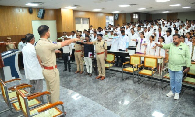 నల్లగొండ పట్టణ కేంద్రంలో మెడికల్ కాలేజ్లో నిర్వహించిన యాంటీ ర్యాగింగ్ అవగాహన సదస్సులో జిల్లా యస్పి మాట్లాడుతూ, “ర్యాగింగ్ అనే విష సంస్కృతికి దూరంగా ఉండాలి” అని, తమ తోటి విద్యార్థులతో సోదరభావంతో మేల్కొనాలని, సీనియర్లు, జూనియర్లు అని బేదం వీడనాడుతూ, “నేటి సీనియర్లు ఒకప్పుడు జూనియర్లు” అనే విషయం మరచిపోవద్దు” అని అన్నారు. తోటి విద్యార్థులపై ర్యాగింగ్కు పాల్పడి తమ విలువైన జీవితాలను నాశనం చేసుకోవద్దని అన్నారు. ప్రొహిబిషన్ ర్యాగింగ్ యాక్ట్ ప్రకారం, ర్యాగింగ్కు పాల్పడితే ఒకసారి కేసు నమోదైతే, 6 నెలల నుండి 3 సంవత్సరాల వరకు జైలు శిక్ష ఉంటుందని చెప్పారు. ర్యాగింగ్ అనగా వ్యక్తులను, మానసికంగా లేదా శారీరకంగా అవమానపరచడం, భయపెట్టడం, భయం కలిగేటట్లు చేయడం, వారి పట్ల అమర్యాదగా ప్రవర్తించడం, కొట్టడం తదితర అంశాలు ర్యాగింగ్ చట్టంలోకి వస్తాయని పీపీటీ ద్వారా అవగాహన కల్పించారు. సరదా కోసం చేసే ర్యాగింగ్ వల్ల అనర్దాలు జరుగుతాయని, చట్టాలు కూడా చాలా పటిష్టంగా ఉన్నాయని, ర్యాగింగ్ చేస్తే కేసులు నమోదు చేయబడతాయని చెప్తూ, విద్యార్థులతో ప్రతిజ్ఞ చేయిస్తూ “ర్యాగింగ్ అనే భూతాన్ని కళాశాల నుండి తరిమేయాలని” సూచించారు. ఎంతో కష్టపడి చదివి మెడికల్ కాలేజీలో సీటు సంపాదించుకొని ర్యాగింగ్ అనే క్షణిక పాశవిక ఆనందానికి చేస్తే, కేసులు నమోదై, జైలు కి వెళ్తే వారి తల్లిదండ్రులు ఎంత బాధపడతారో కూడా గుర్తు పెట్టుకోవాలని సూచించారు. ఎవరైనా ర్యాగింగ్కు పాల్పడితే సంబంధిత పోలీస్ స్టేషన్ లేదా డయల్ 100 ద్వారా సమాచారం అందించాలని అన్నారు. ఈ కార్యక్రమంలో డిఎస్పి నల్గొండ కె శివరాం రెడ్డి, ఎస్బి సిఐ రాము,వన్ టౌన్ సిఐ రాజశేఖర్ రెడ్డి, ఎస్సై సైదులు కళాశాల ప్రిన్సిపాల్ సత్యనారాయణ, వైస్ ప్రిన్సిపాల్ రాధాకృష్ణ, విద్యార్థులు తదితరులు పాల్గొన్నారు.