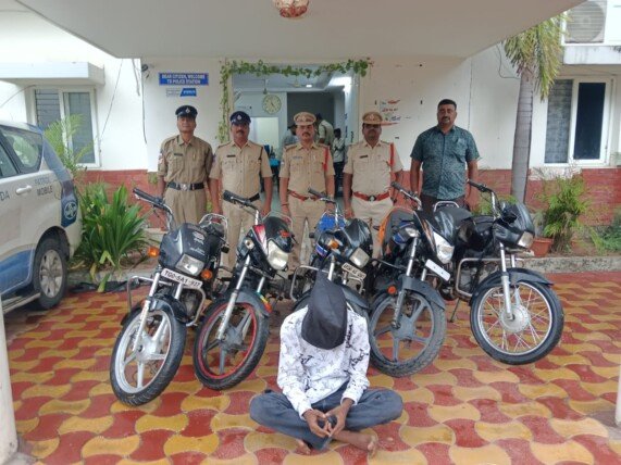 విలువైన మోటార్ సైకిల్ దొంగతనాలకు పాల్పడుచున్న దొంగల అరెస్టు. (05) మోటార్ సైకిల్లు స్వాధీనము. గత కొంత కాలం నుండి నల్లగొండ టౌన్, హాలియా, మిర్యాలగూడ, వాడపల్లి ప్రాంతాల్లో మోటార్ సైకిళ్ళు దొంగతనాలకు పాల్పడుతున్న నేరస్థున్ని అరెస్టు చేసి అతని వద్ధ నుండి రూ.5 లక్షల విలువైన (5) మోటార్ సైకిళ్ళు స్వాధీనము చేసుకొనైనధి. కొండేటి సంతోష్ కుమార్ s/o సైదులు, వయస్సు.19 సంవత్సరములు, కులము.SC(మాధిగ), వృత్తి.కూలి r/o బొక్కముంతలపాడు గ్రామము, నిడమనూరు మండలము, నల్గొండ జిల్లా నేరస్థుడు కొండేటి సంతోష్ కుమార్ s/o సైదులు, వయస్సు.19 సంవత్సరములు పధవ తరగతి వరకు చధువుకుని కూలి పనికి వెల్లుచూ త్రాగుడు మరియు ఇతర వ్యసనాలకు అలవాటు పడి అతనితో పాటు పనికి వచ్చిన ఒక మైనర్ బాలునితో స్నేహము చేసి ఇద్దరు కలిసి చెడు వ్యసనాలకు బానిస అయ్యి మోటార్ సైకిల్ ధోంగతనాలు చేయాలని నిర్ణయించుకుని వారిద్దరు కలిసి నల్లగొండ, హాలియా, మిర్యాలగూడ, వాడపల్లి ప్రాంతాల్లో మోటార్ సైకిళ్ళు దొంగతనాలకు పాల్పడినారు. హాలియా లో ధోంగతనము చేసిన ఒక మోటార్ సైకిల్ ను గుంటూరులో అమ్మి వచ్చిన డబ్బులను తమ జల్సాలకు ఖర్చు చేసినారు. గత నెల తేధి 25-06-2025 రోజున గుంటూరు జిల్లా మాచవరం మండలము పిన్నెల్లి గ్రామానికి చెందిన షేక్ మాబు వలి తన యొక్క స్ప్లెండర్ ప్లస్ మోటార్ సైకిల్ ను రైల్వే స్టేషన్ లో పార్క్ చేయగా ఎవరో గుర్తు తెలియని ధోంగలు అతని మోటార్ సైకిల్ ను ధోంగిలించగా అతడు నల్లగొండ టూ టౌన్ పోలీసు స్టేషన్ లో ధరఖాస్తు చేయగా నల్లగొండ టూ టౌన్ పోలీసు స్టేషన్ SHO అయిన వై.సైదులు కేసు నమోధు పర్చినారు. ఇట్టి కేసులో జిల్లా SP నేరస్తులను కనిపెట్టడానికి ప్రత్యేక టీములను ఏర్పాటు చేయనైనధి. ఉదయము 6 గంటల సమయములో పానగల్ బైపాస్ రోడ్డు, నల్లగొండ వద్ద వాహనాలను తనిఖీ చేస్తుండగా నేరస్థుడు కొండేటి సంతోష్ కుమార్ మరియు ఒక మైనర్ బాలునితో కలిసి నల్లగొండ II టౌన్ పోలీసు స్టేషన్ పరిధిలో ధోంగిలించిన మోటార్ సైకిల్ మీధ వెల్లుచూ అనుమానాస్పదంగా కనిపించడం తో నల్గొండ-II టౌన్ పోలీసులు పట్టుబడి చేసి నేరస్తుని వద్ధ నుండి హాలియా లో ధోంగిలించిన (02) మోటార్ సైకిళ్ళు, మిర్యాలగూడ కు చెందిన (01) మోటార్ సైకిల్, వాడపల్లి కి చెందిన(01) మోటార్ సైకిల్, నల్లగొండ టూ టౌన్ పోలీసు స్టేషన్ పరిధిలో ధోంగిలించిన (01) మోటార్ సైకిళ్ళను స్వాదీన పరచుకోవడం జరిగింది. ఇట్టి కేసును నల్గొండ DSP, K.శివరాం రెడ్డి పర్యవేక్షణలో Nalgonda II town సర్కిల్ ఇన్స్పెక్టర్ S.రాఘవ రావు ఆద్వర్యంలో ఇట్టి నేరస్థున్ని పట్టుబడి చేసి మోటార్ సైకిళ్ళు రికవరీ చేసిన నల్గొండ II టౌన్ యస్. ఐ Y.సైదులు మరియు వారి సిబ్బంది హెడ్ కానిస్టేబుల్ పాయిలి రాజు, మరియు కానిస్టేబుల్ లావూరి బాలకోటి లను జిల్లా SP అభినందించనైనది.